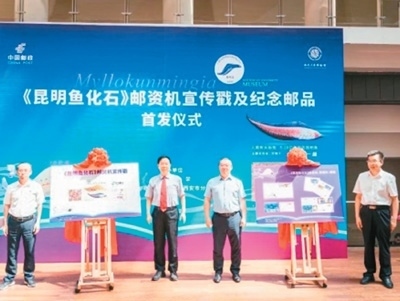 2023年5月,《昆明魚化石》郵資機(jī)宣傳戳及系列紀(jì)念郵品在西北大學(xué)博物館首發(fā)。此次啟用的《昆明魚化石》郵資機(jī)宣傳戳,是以中國科學(xué)院院士、西北大學(xué)教授舒德干團(tuán)隊(duì)發(fā)現(xiàn)的鳳姣昆明魚化石為原型設(shè)計(jì)制作。鳳姣昆明魚距今已5.18億年,是已知最古老的脊椎動(dòng)物。該魚的發(fā)現(xiàn),為揭示寒武紀(jì)大爆發(fā)奧秘、破解遠(yuǎn)古生命演化謎團(tuán)提供了獨(dú)特的劃時(shí)代里程碑證據(jù)。圖為首發(fā)儀式現(xiàn)場。中新社發(fā)