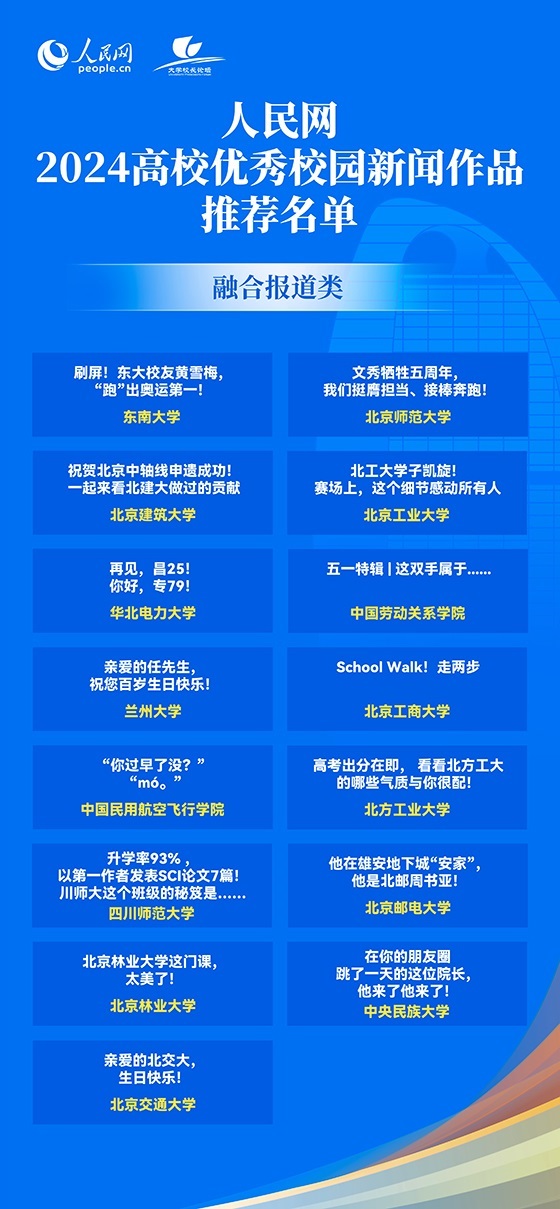 人民網(wǎng)北京12月27日電 (記者孫競、李依環(huán))以“推進教育科技人才一體發(fā)展 加快建設(shè)教育強國”為主題的人民網(wǎng)2024大學校長論壇27日在人民網(wǎng)“初心”報告廳舉行。論壇上,人民網(wǎng)2024年高校優(yōu)秀校園新聞作品發(fā)布,50所高校作品入選。