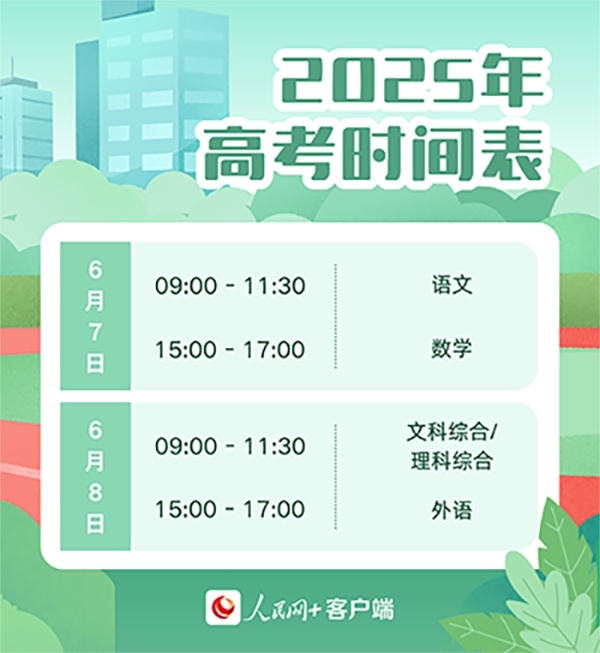 具體科目考試時(shí)間安排為6月7日9:00至11:30語文;15:00至17:00數(shù)學(xué)。6月8日9:00至11:30文科綜合/理科綜合;15:00至17:00外語,有外語聽力測(cè)試內(nèi)容的一般應(yīng)安排在外語筆試考試開始前進(jìn)行。