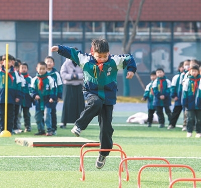 青島市李滄區(qū)是山東省內(nèi)較早推廣15分鐘課間的地區(qū),當(dāng)?shù)馗餍R虻刂埔?,結(jié)合校園特色將體育活動開展得豐富多彩。青島東川路小學(xué)在操場分設(shè)6個(gè)活動點(diǎn),地面上畫好跳房子、百變大腳丫、步步登高、投擲區(qū)等不同格子,由班主任帶領(lǐng)學(xué)生,開發(fā)多種闖關(guān)類游戲,鼓勵學(xué)生創(chuàng)造新玩法。