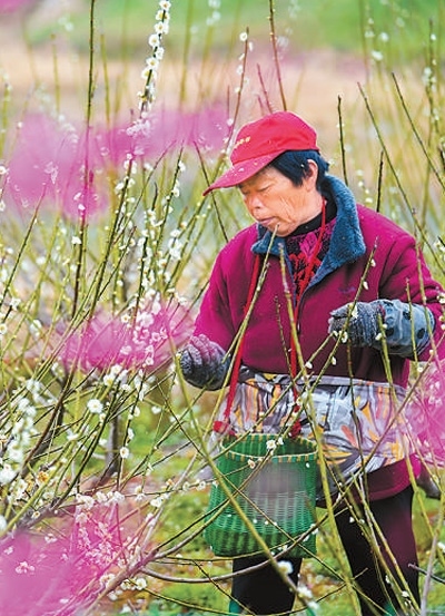 浙江省湖州市長(zhǎng)興縣龍山街道的東方梅園內(nèi),梅農(nóng)正在采摘梅花,用于制作梅花香水、梅花精油等產(chǎn)品。