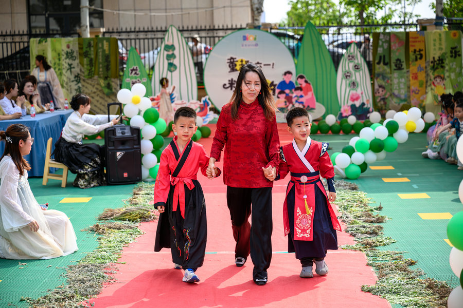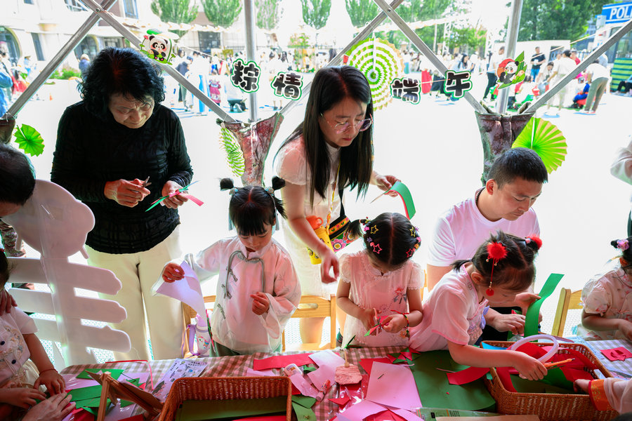活動(dòng)現(xiàn)場(chǎng),家長(zhǎng)與幼兒共同感受六一兒童節(jié)的歡樂(lè)氛圍與端午節(jié)的民俗魅力。