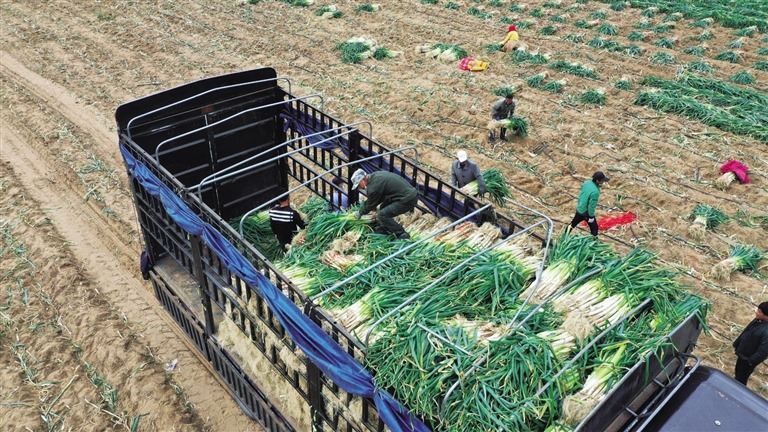 正在忙著收蔥打捆的村民于新穎說:“看這蔥長(zhǎng)得多好!”