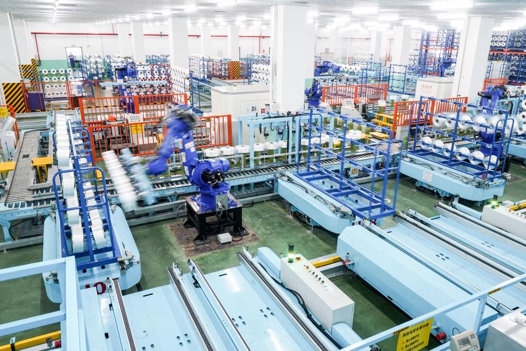 位于江蘇省蘇州市吳江區(qū)盛澤鎮(zhèn)的一家智能車間,機器人在車間內自動作業(yè)。新華社記者 李博 攝