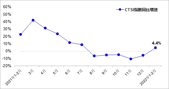 數(shù)據(jù)顯示,2022年1-2月,中國運(yùn)輸生產(chǎn)指數(shù)(CTSI)均值為153.8點(diǎn),同比增長4.4%。分結(jié)構(gòu)看,CTSI貨運(yùn)指數(shù)均值為188.2點(diǎn),同比增長4.1%;CTSI客運(yùn)指數(shù)均值為83.8點(diǎn),同比增長4.7%。