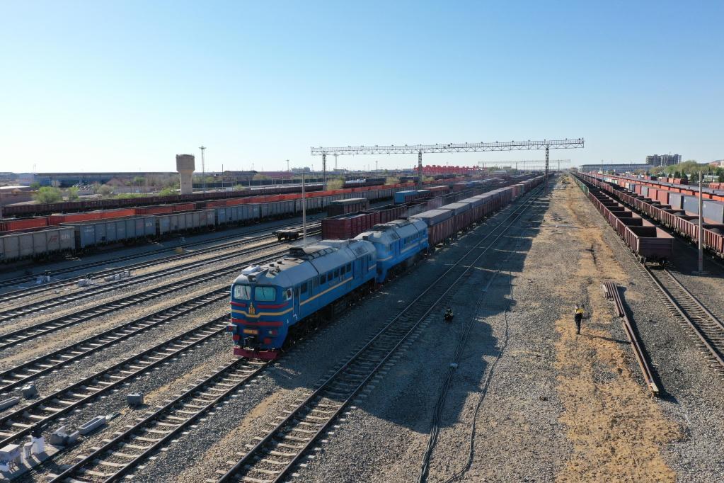 5月25日,“二連號”寬軌集裝箱專列行駛在二連浩特鐵路口岸。(受訪者供圖)