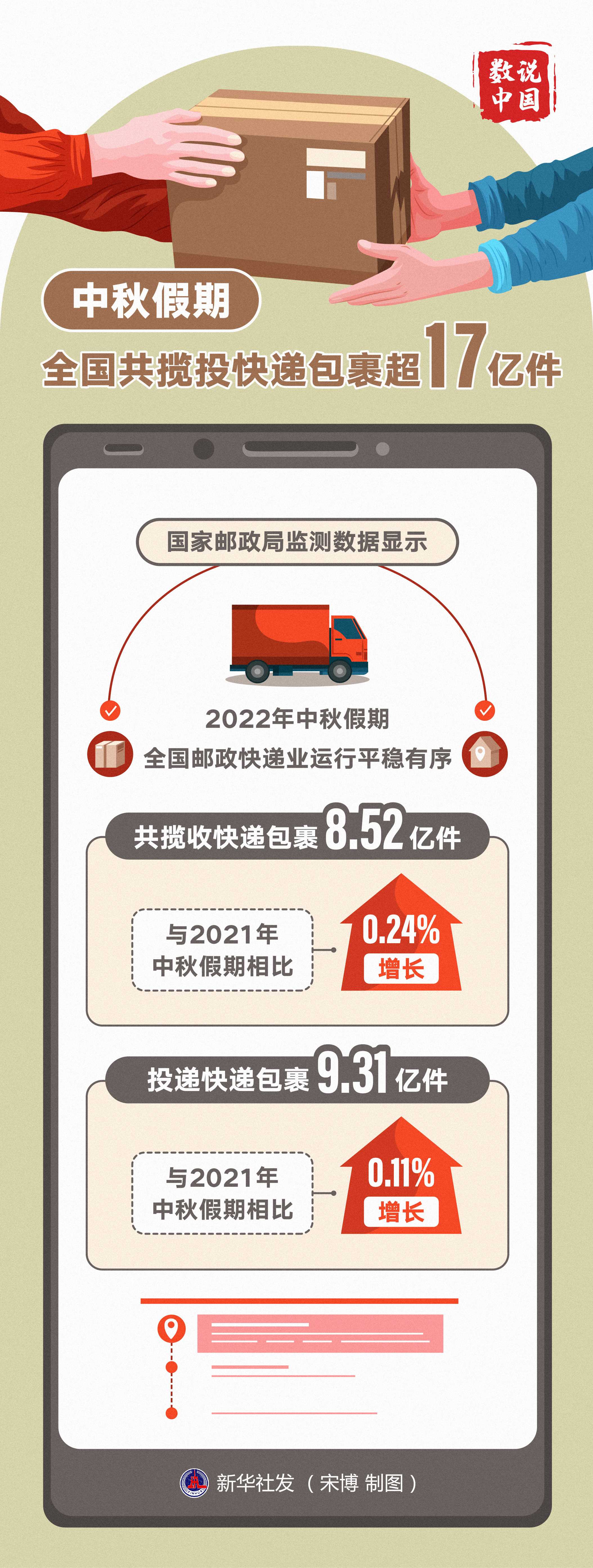 國家郵政局監(jiān)測數(shù)據(jù)顯示,2022年中秋假期全國郵政快遞業(yè)運(yùn)行平穩(wěn)有序,共攬收快遞包裹8.52億件,與2021年中秋假期相比增長0.24%;投遞快遞包裹9.31億件,與2021年中秋假期相比增長0.11%。