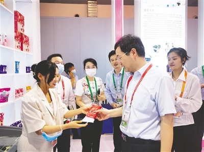 第二屆中國國際消費品博覽會(以下簡稱消博會)在海南省??谑信e辦。內蒙古展館的綠色優(yōu)質產品引來圍觀。蒙牛乳業(yè)、敖漢小米、科爾沁牛肉、芥花油等內蒙古多個綠色優(yōu)質品牌及產品亮相消博會。同時,70多家交易商組成內蒙古展團觀展。本屆消博會主題為“共享開放機遇共創(chuàng)美好生活”,于7月25日開幕,為期6天。(文/圖 本報記者 李永桃)