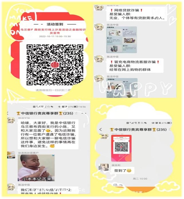 該行各網點組織開展“防范電信詐騙——中信銀行守護您的金融安全”主題線上沙龍活動,300余人積極參與,進一步提高公眾金融素養(yǎng)。同時,該行充分利用線上宣傳渠道,通過專業(yè)人員講解、互動提問答題、電子宣傳手冊等方式,向社會公眾宣傳電信詐騙知識。并對學生、老年人等易受騙群體進行針對性反詐警示教育,揭露電信詐騙犯罪手法和危害,以及教授如何識別、如何應對、防止上當受騙等方法。
