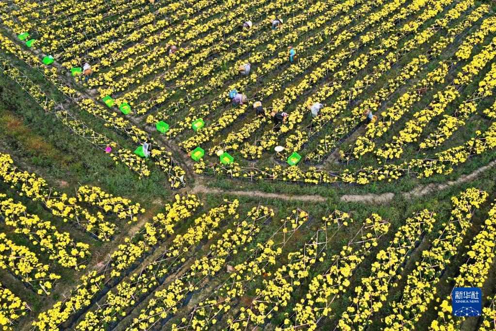 10月21日,村民在貴州省貴定縣云霧鎮(zhèn)菊花種植基地采摘金絲皇菊(無人機(jī)照片)。新華社記者 楊文斌 攝