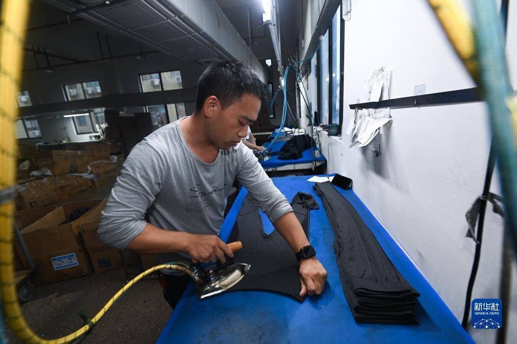 10月27日,在浙江省諸暨市大唐街道的一家專業(yè)生產(chǎn)拉絨打底褲產(chǎn)品的企業(yè)車間內(nèi),工作人員在加工拉絨打底褲。新華社記者 徐昱 攝
