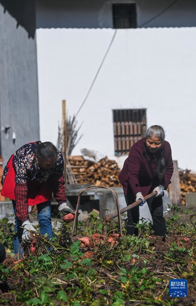 11月23日,浙江省建德市更樓街道橋嶺村的村民在收獲地瓜。新華社記者 徐昱 攝