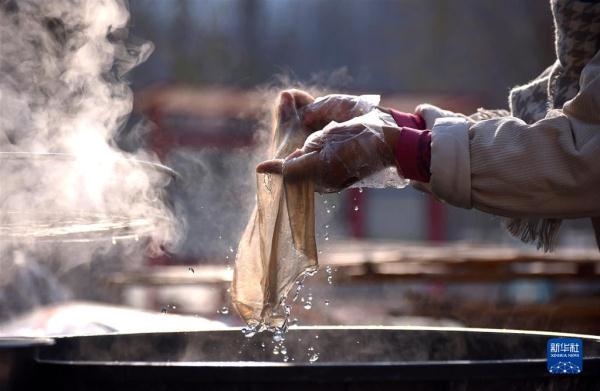 12月6日,山東省淄博市沂源縣石橋鎮(zhèn)石樓村的村民在加工粉皮。新華社發(fā)(趙東山 攝)