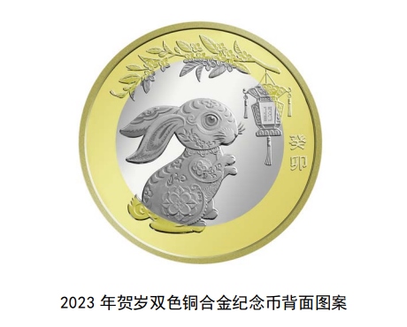 金銀紀(jì)念幣正面圖案均為中華人民共和國(guó)國(guó)徽,并刊國(guó)名、年號(hào)“2023”;背面圖案均為“福”字、舞獅造型等組合設(shè)計(jì),并刊面額。雙色銅合金紀(jì)念幣正面圖案為“中國(guó)人民銀行”、“10元”字樣,漢語(yǔ)拼音字母“SHIYUAN”及年號(hào)“2023”,底紋襯以團(tuán)花圖案;背面主景圖案為中國(guó)傳統(tǒng)剪紙藝術(shù)與裝飾年畫(huà)元素相結(jié)合的兔子形象,襯景圖案為花燈和桂枝、桂花,幣面左側(cè)刊“癸卯”字樣。