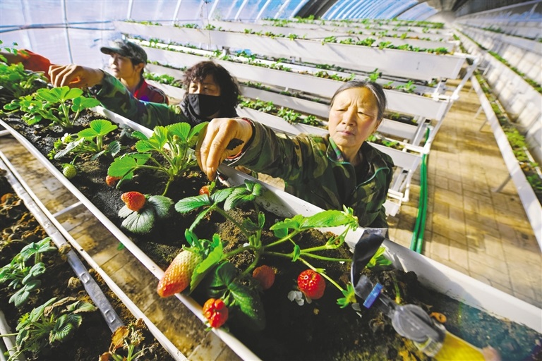 春節(jié)期間,蘇尼特右旗賽漢塔拉鎮(zhèn)扶貧產(chǎn)業(yè)園區(qū)的日光大棚里,菜農(nóng)們正在采摘立體種植的草莓。當(dāng)?shù)攸h委政府引導(dǎo)居民整合土地建設(shè)日光溫室大棚,以“土地入股企業(yè)分紅”“承包大棚按企業(yè)要求種植”“務(wù)工就業(yè)”等方式實(shí)現(xiàn)增收致富。(記者 王曉博 攝)