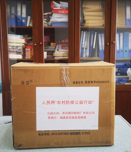 福建省連城縣蓮峰鎮(zhèn)收到蘇州第四制藥廠通過人民網(wǎng)“防疫互助平臺”捐贈的右布洛芬膠囊。曾金水?dāng)z