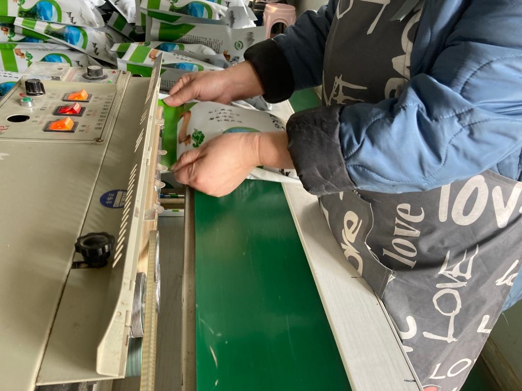 悅來頤和食用菌種植專業(yè)合作社社員在進(jìn)行猴頭菇產(chǎn)品包裝塑封。新華社記者 金地 攝