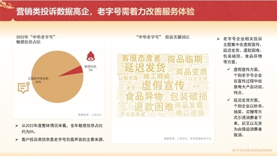 《報告》同時指出,在消費者側(cè),客戶投訴類信息是老字號負(fù)面聲音的主要來源,老字號企業(yè)相關(guān)投訴主題集中在虛假宣傳、延遲發(fā)貨、退款困難、包裝破損、食品異物等方面。這些問題不僅影響了消費者體驗,也不利于企業(yè)自身保持優(yōu)質(zhì)的聲譽形象。
