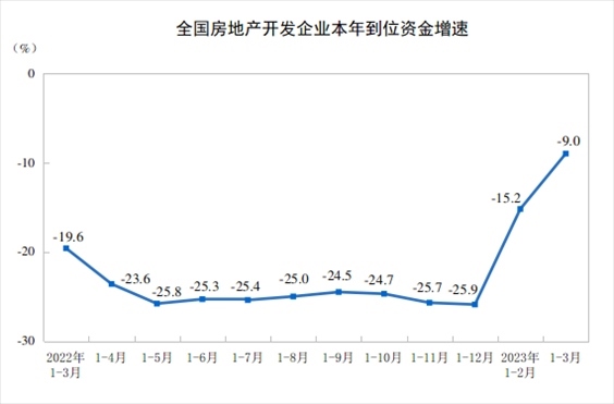 1—3月份,房地產(chǎn)開發(fā)企業(yè)到位資金34708億元,同比下降9.0%。其中,國內貸款4995億元,下降9.6%;利用外資8億元,下降22.7%;自籌資金10171億元,下降17.9%;定金及預收款11909億元,下降2.8%;個人按揭貸款6188億元,下降2.9%。
