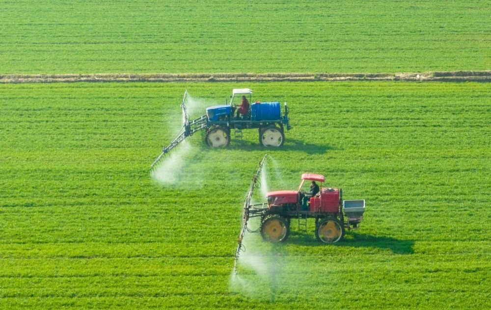 2月28日,在江蘇省海安市大公鎮(zhèn)王院村,村民駕駛植保機在小麥田間進行噴灑藥物作業(yè)(無人機圖片)。新華社發(fā)(翟慧勇 攝)