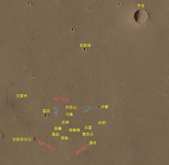 科學(xué)研究團(tuán)隊(duì)通過火星高分影像,識(shí)別了著陸點(diǎn)附近大量的地理實(shí)體,國際天文聯(lián)合會(huì)根據(jù)相關(guān)規(guī)則,將其中的22個(gè)地理實(shí)體,以中國人口數(shù)小于10萬的歷史文化名村名鎮(zhèn)加以命名。將中國標(biāo)識(shí)永久刻印在火星大地。