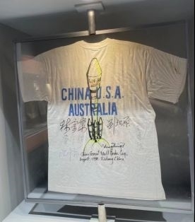 再給大家推薦一個不容錯過的“打卡點”:澳星發(fā)射成功紀念T恤。這件T恤全部都是著名航天老專家們的“親簽”:林宗棠(時任航空航天部部長)、劉紀原(時任航空航天部副部長)、沈辛蓀(時任中國運載火箭研究院院長)、王德臣(時任長二E火箭總設計師)、屠守鍔(時任長二E火箭技術總顧問)等。在紀念T恤的C位,還有劉竹生院士親筆畫的長征二號E運載火箭(即“長二捆”火箭)的漫畫圖。可謂眾“星”云集,珍貴程度可想而知。