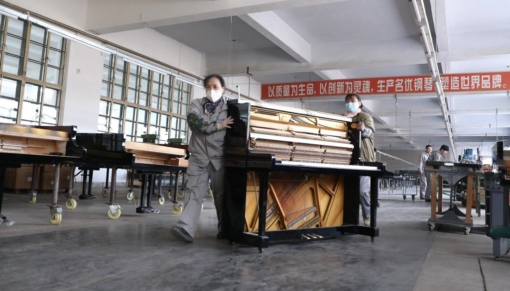 2月21日,工人在東北鋼琴樂(lè)器有限公司車(chē)間內(nèi)推運(yùn)鋼琴組件,趕制外貿(mào)訂單。新華社記者 姚劍鋒 攝