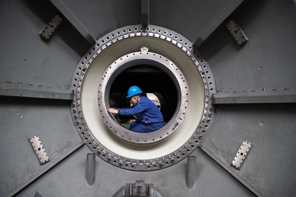 4月28日,工人在哈電集團(tuán)哈爾濱汽輪機(jī)廠有限責(zé)任公司車(chē)間內(nèi)生產(chǎn)作業(yè)。新華社記者 張濤 攝