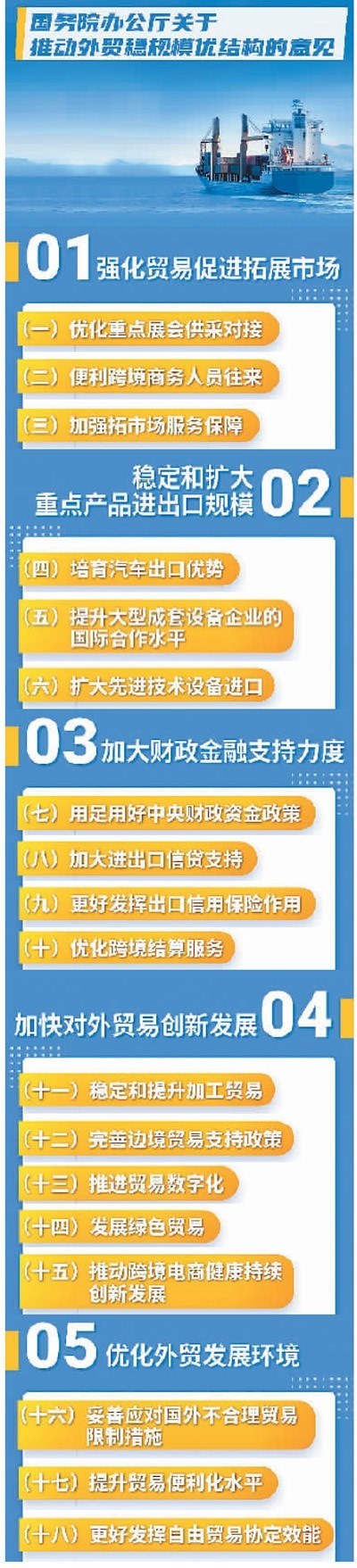 為推動外貿穩(wěn)規(guī)模優(yōu)結構,在前期已出臺多輪政策舉措的基礎上,國務院辦公廳4月25日對外發(fā)布《關于推動外貿穩(wěn)規(guī)模優(yōu)結構的意見》(以下簡稱《意見》),推出新一輪措施。專家認為,此次提出的18條具體措施既涉及重點產品,也關乎市場拓展和貿易創(chuàng)新,具有很強的針對性和操作性,有助于穩(wěn)住外貿規(guī)模,并在此基礎上進一步優(yōu)化外貿結構,推動實現全年進出口促穩(wěn)提質目標任務。