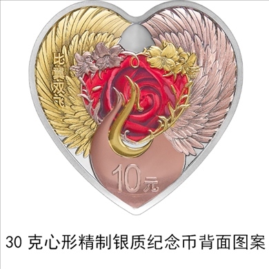 30克心形銀質(zhì)紀(jì)念幣為精制幣,含純銀30克,外接正方形邊長(zhǎng)40毫米,面額10元,成色99.9%,最大發(fā)行量50000枚。