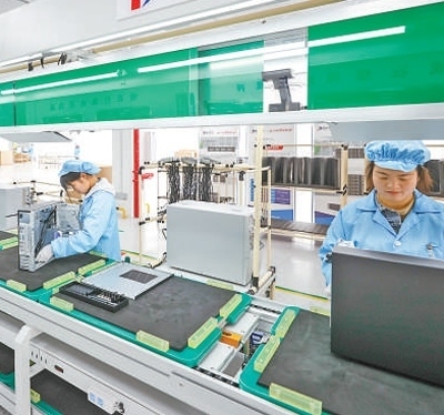 工人在畢節(jié)一家計(jì)算機(jī)生產(chǎn)企業(yè)產(chǎn)線(xiàn)上組裝產(chǎn)品。陳 曦?cái)z(人民視覺(jué))