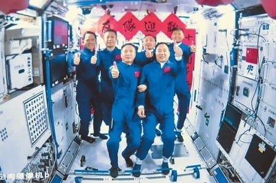 神舟十五號航天員乘組與神舟十六號航天員乘組拍下“全家?!?。
