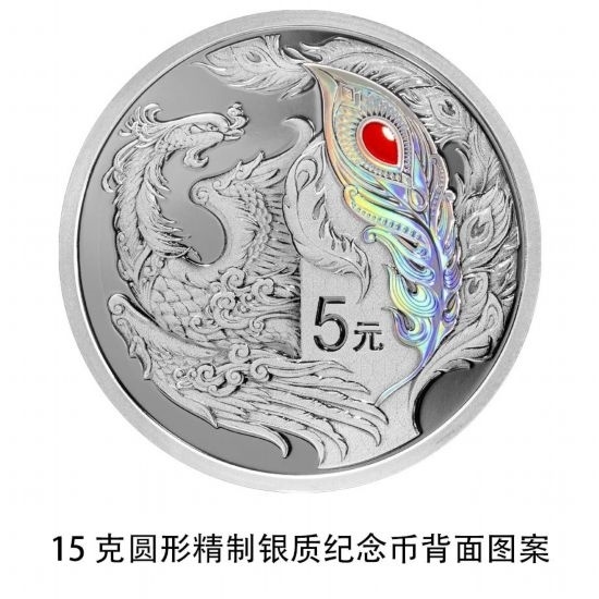 15克圓形銀質(zhì)紀(jì)念幣背面圖案為鳳凰造型,并刊面額。