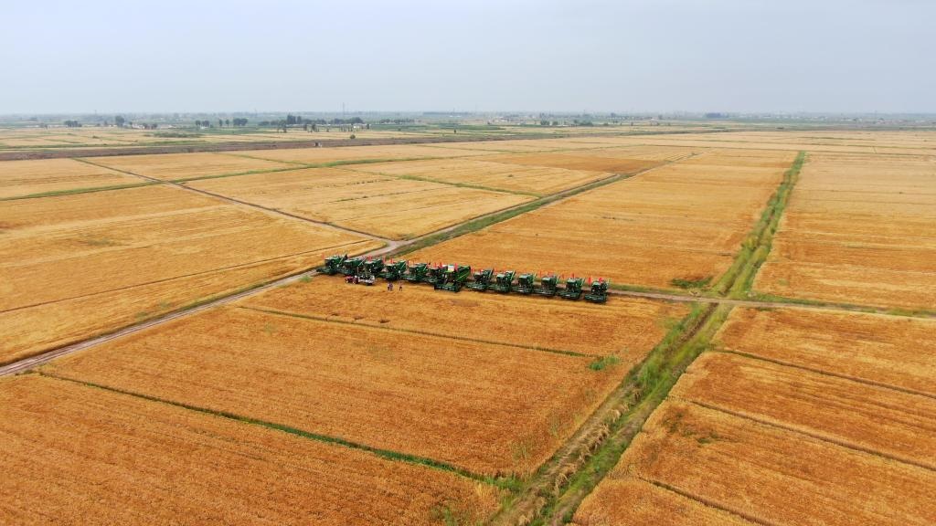 后旗蒙海鎮(zhèn)紅建村萬(wàn)畝小麥連片示范創(chuàng)意園內(nèi)聯(lián)合收割機(jī)準(zhǔn)備收割小麥。新華社記者侯維軼 攝