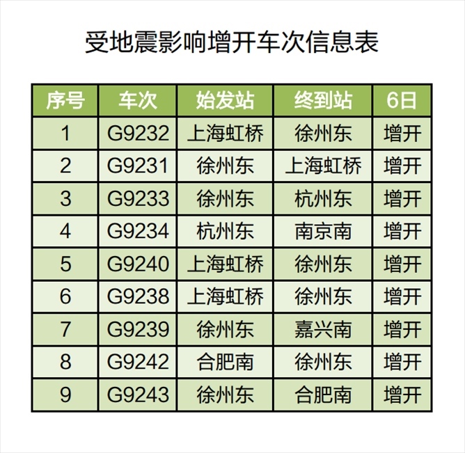 人民網(wǎng)北京8月6日電 (記者王連香)記者從中國鐵路上海局集團(tuán)有限公司獲悉,受8月6日山東省德州市平原縣發(fā)生5.5級地震影響,為確保列車運行安全,鐵路部門計劃對途經(jīng)京滬高鐵部分列車采取限速、停運等措施;同時,根據(jù)旅客出行需要,計劃增開途經(jīng)京滬高鐵長三角管內(nèi)區(qū)段部分列車,滿足管內(nèi)旅客出行需要。截至當(dāng)日11時30分,計劃停運92趟列車、增開9趟列車。