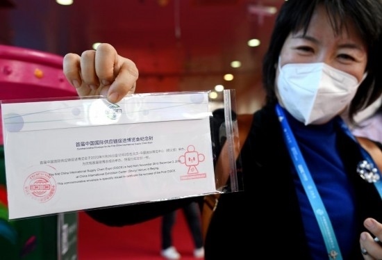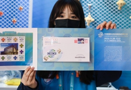 11月29日,一名觀展者在自己購(gòu)買的鏈博會(huì)紀(jì)念郵封上加蓋了帶有“鏈氪”形象的紀(jì)念郵戳。