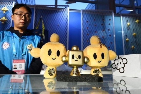 11月29日,在鏈博會(huì)文創(chuàng)小店的柜臺(tái)上放置著“鏈氪”形象的文創(chuàng)用品供觀展者選購(gòu)。