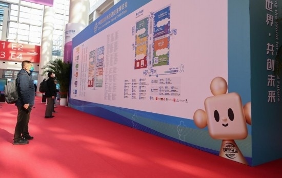 11月29日,鏈博會(huì)會(huì)場(chǎng)入口處的地圖導(dǎo)引墻上印有吉祥物“鏈氪”的形象。