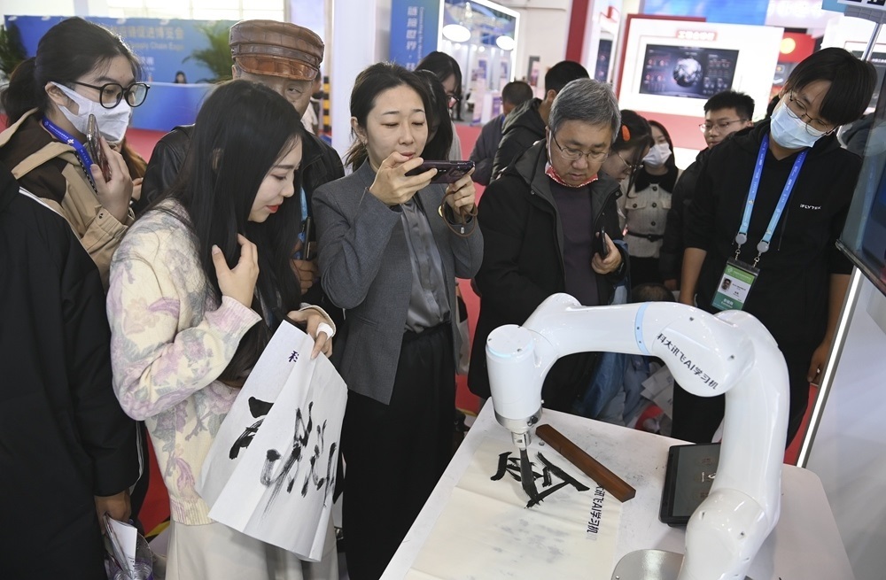 參觀者在首屆中國國際供應(yīng)鏈促進博覽會數(shù)字科技鏈展區(qū)科大訊飛展位觀看一款A(yù)I書法機器人寫毛筆字(2023年12月2日攝)。新華社記者 蔡湘鑫 攝