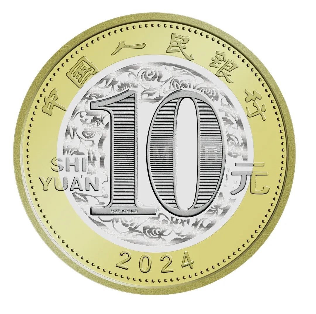 雙色銅合金紀念幣正面圖案為“中國人民銀行”、“10元”字樣,漢語拼音字母“SHIYUAN”及年號“2024”,底紋襯以團花圖案。