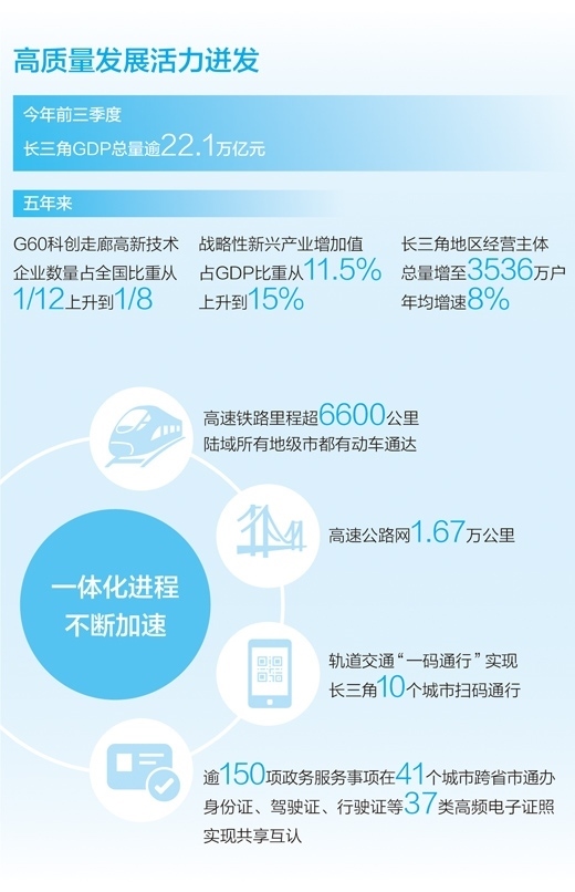 今年前三季度,長(zhǎng)三角GDP總量逾22.1萬(wàn)億元,占全國(guó)GDP總量比重較2022年同期有所提升,三省一市經(jīng)濟(jì)增速均超過了全國(guó)平均水平;作為長(zhǎng)三角一體化發(fā)展國(guó)家戰(zhàn)略的先手棋和突破口,長(zhǎng)三角生態(tài)綠色一體化發(fā)展示范區(qū)掛牌以來,共形成136項(xiàng)務(wù)實(shí)有效的制度創(chuàng)新成果,其中38項(xiàng)已面向全國(guó)復(fù)制推廣;已有逾150項(xiàng)政務(wù)服務(wù)事項(xiàng)可在長(zhǎng)三角41個(gè)城市跨省市通辦,實(shí)現(xiàn)身份證、駕駛證、行駛證等37類高頻電子證照的共享互認(rèn)……