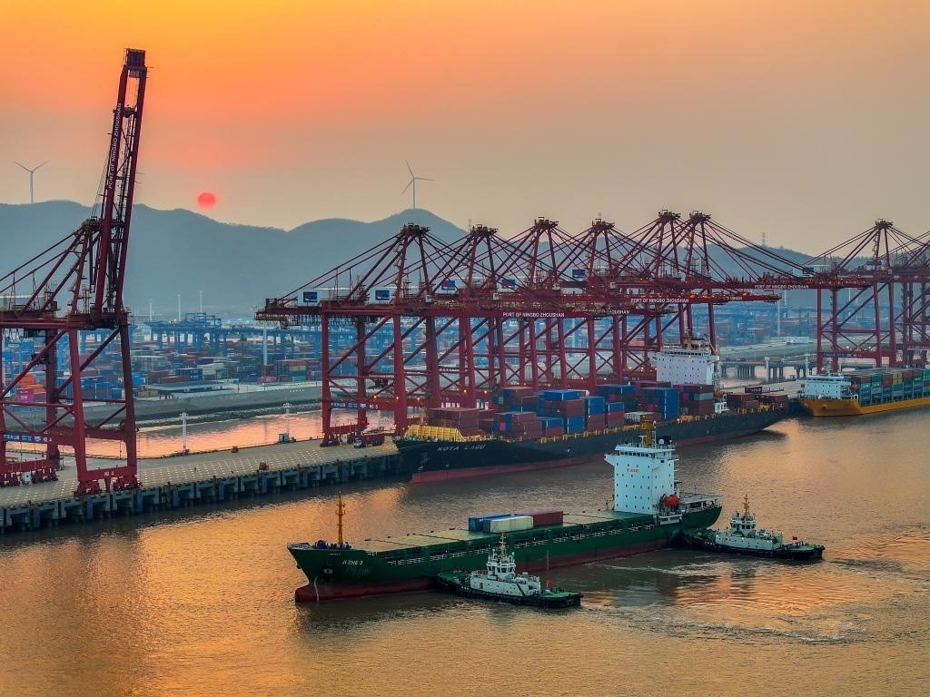 2024年2月11日,寧波舟山港金塘港區(qū)船來(lái)船往,碼頭作業(yè)繁忙(無(wú)人機(jī)照片)。新華社發(fā)(姚峰攝)