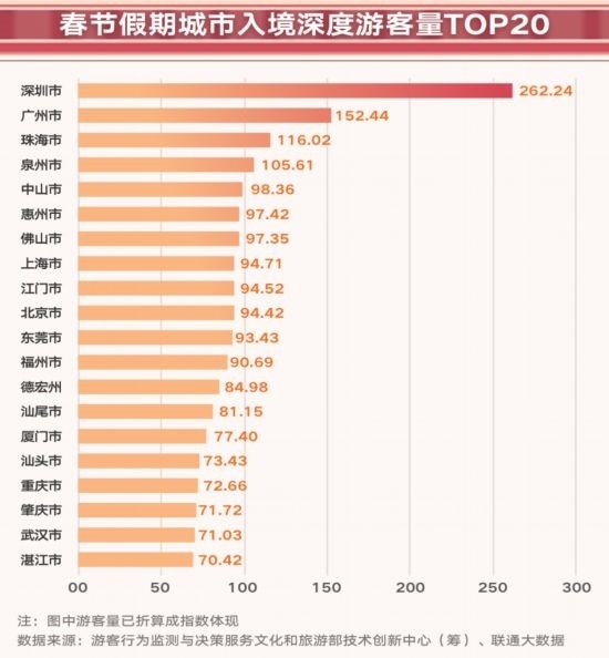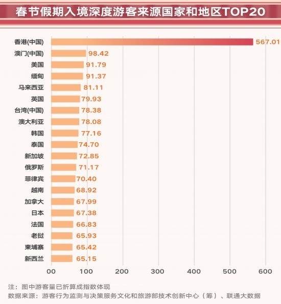 春節(jié)假期期間, 136.6萬人的入境深度游客(來自境外,并在大陸城市停留6小時以上的游客人數(shù),以下簡稱“深度游”)的大數(shù)據(jù)樣本顯示,入境游客量前20的城市共接待入境深度游客87.0萬人。