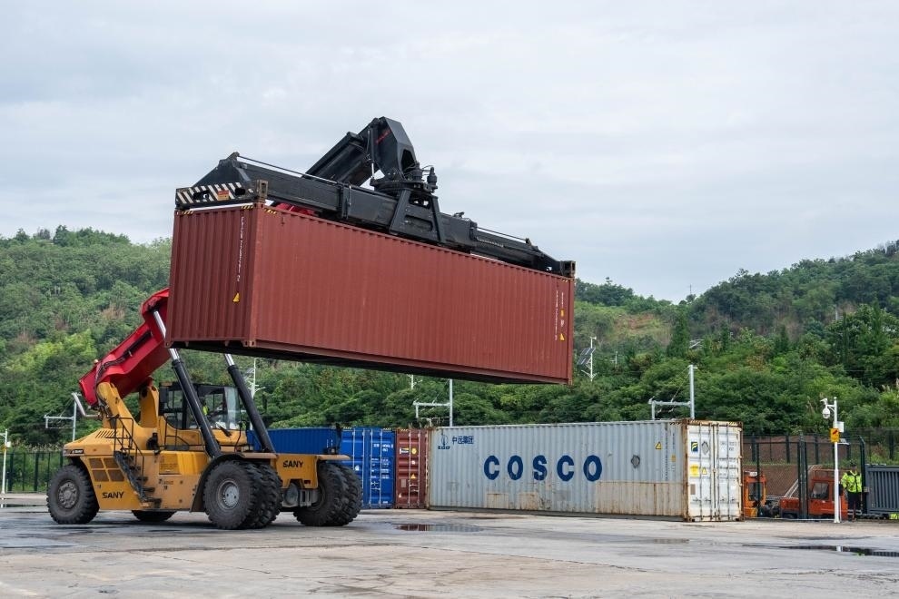 6月20日,在株洲中車物流園,工作人員在進(jìn)行集裝箱裝車作業(yè)。新華社記者陳思汗攝