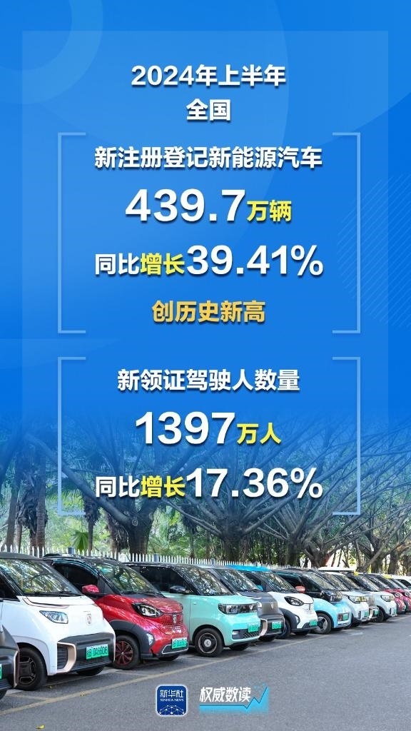 公安部7月8日發(fā)布最新統(tǒng)計數(shù)據(jù),截至2024年6月底,全國機動車保有量達4.4億輛,機動車駕駛?cè)?.32億人;上半年新注冊登記新能源汽車439.7萬輛,同比增長39.41%,創(chuàng)歷史新高;上半年全國新領證駕駛?cè)藬?shù)量1397萬人。