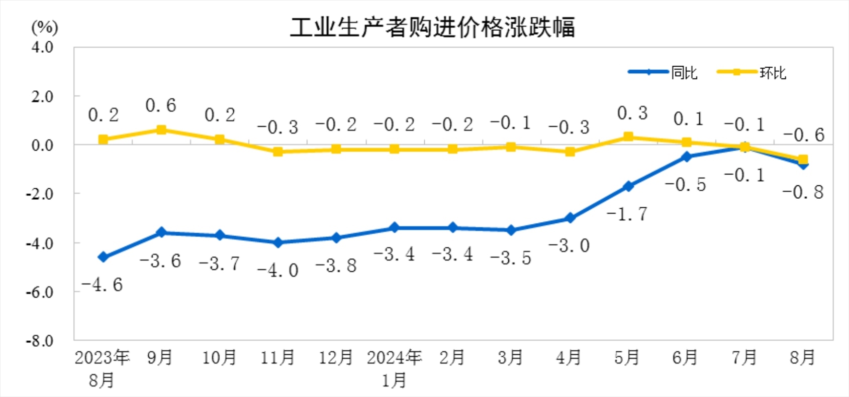 2024年8月份,全國工業(yè)生產者出廠價格同比下降1.8%,環(huán)比下降0.7%;工業(yè)生產者購進價格同比下降0.8%,環(huán)比下降0.6%。1—8月平均,工業(yè)生產者出廠價格比上年同期下降1.9%,工業(yè)生產者購進價格下降2.1%。