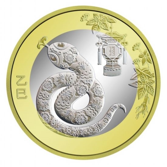 背面圖案方面,雙色銅合金紀(jì)念幣背面圖案為中國傳統(tǒng)剪紙藝術(shù)與裝飾年畫元素相結(jié)合的蛇形象,襯以花燈和人參圖案,幣面左側(cè)刊“乙巳”字樣。