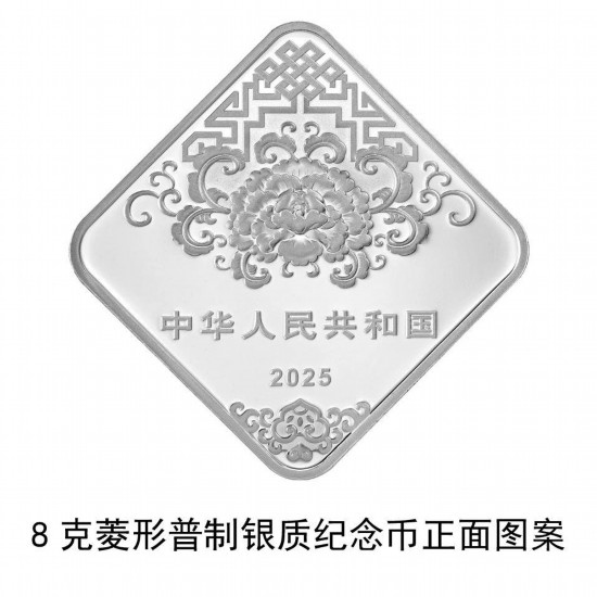 8克菱形銀質(zhì)紀(jì)念幣背面圖案為貼“?!弊謭鼍?,并刊面額。