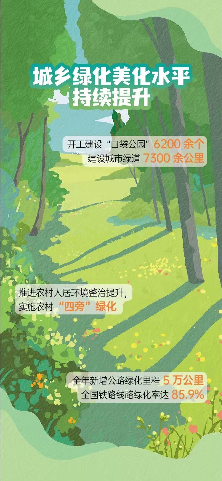 張利明介紹,過去一年,山水林田湖草沙系統(tǒng)治理取得新進(jìn)展,城鄉(xiāng)綠化美化水平持續(xù)提升。組織實(shí)施176個(gè)“雙重”工程項(xiàng)目、10個(gè)國(guó)土綠化示范項(xiàng)目。推進(jìn)實(shí)施“十四五”27個(gè)山水林田湖草沙一體化保護(hù)和修復(fù)工程項(xiàng)目、49個(gè)歷史遺留廢棄礦山生態(tài)修復(fù)示范工程項(xiàng)目。森林可持續(xù)經(jīng)營(yíng)實(shí)施面積擴(kuò)大到66.7萬公頃以上。全國(guó)林草碳匯試點(diǎn)市(縣)和國(guó)有林場(chǎng)碳匯試點(diǎn)實(shí)施面積達(dá)6.8萬公頃。新增水土流失治理面積6.4萬平方公里。開工建設(shè)“口袋公園”6200余個(gè),建設(shè)城市綠道7300余公里。新增公路綠化里程5萬公里,全國(guó)鐵路線路綠化率達(dá)85.9%。