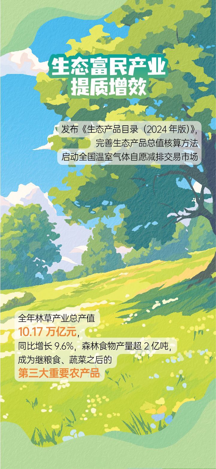 “我們持續(xù)深化改革,推進(jìn)生態(tài)富民產(chǎn)業(yè)提質(zhì)增效?!睆埨髡f,全年林草產(chǎn)業(yè)總產(chǎn)值10.17萬億元,同比增長(zhǎng)9.6%,森林食物產(chǎn)量超2億噸,成為繼糧食、蔬菜之后的第三大重要農(nóng)產(chǎn)品。